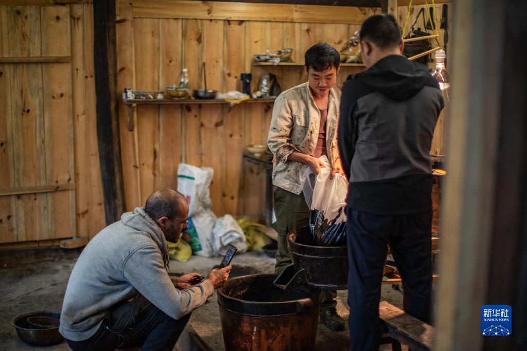 9月21日,在重慶市城口縣北屏鄉松柏村,文森(左)在工作室拍攝記錄黑漆過濾過程。