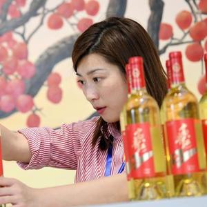 11月2日,在位于陜西省富平縣的云集柿業富平柿園綜合項目接待中心,云集柿業總經理王薇布置展臺上的柿子酒產品。