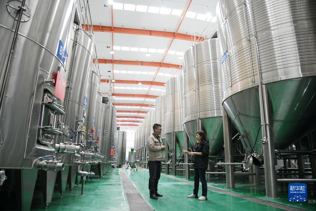 11月2日,在位于陜西省富平縣的云集柿業(yè)富平柿園綜合項(xiàng)目柿酒發(fā)酵車間,云集柿業(yè)總經(jīng)理王薇(右)和生產(chǎn)副廠長張文裕檢查生產(chǎn)設(shè)備。