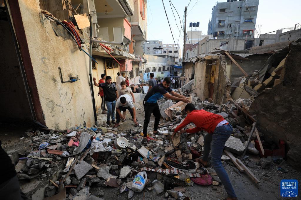 11月3日,在加沙地帶南部城市汗尤尼斯,人們清理遭以色列襲擊后的建筑廢墟。