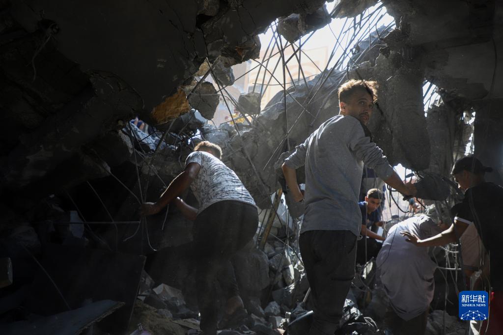 11月3日,在加沙地帶南部城市汗尤尼斯,人們在遭襲擊后的建筑廢墟上實施救援。