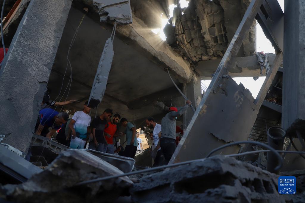 11月3日,在加沙地帶南部城市汗尤尼斯,人們在遭襲擊后的建筑廢墟上實施救援。