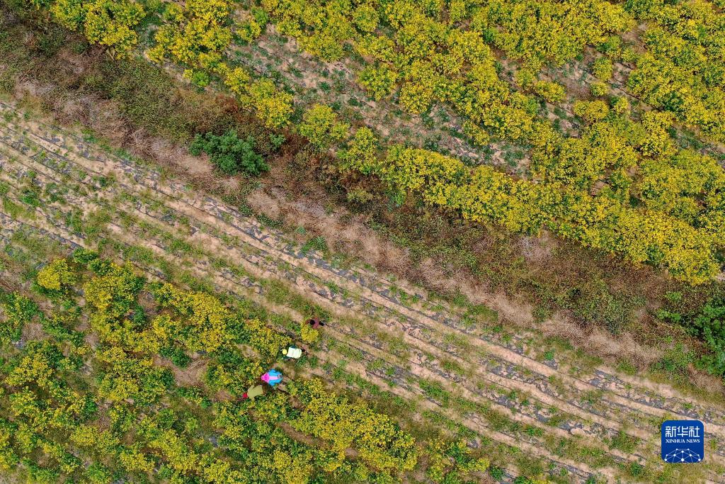 11月3日,村民在神秀谷田園綜合體內收獲菊花(無人機照片)。