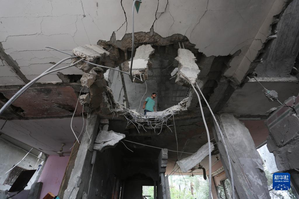 10月29日,在加沙地帶南部城市拉法,一名男子查看被以軍空襲損毀的建筑。