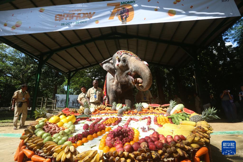 當(dāng)日,雌性大象莫莫在緬甸仰光動物園品嘗由水果和蔬菜制成的蛋糕,慶祝70歲生日。
