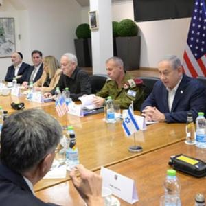 11月3日,在以色列特拉維夫,以色列總理內塔尼亞胡(后排右二)會見到訪的美國國務卿布林肯(前排右二)。