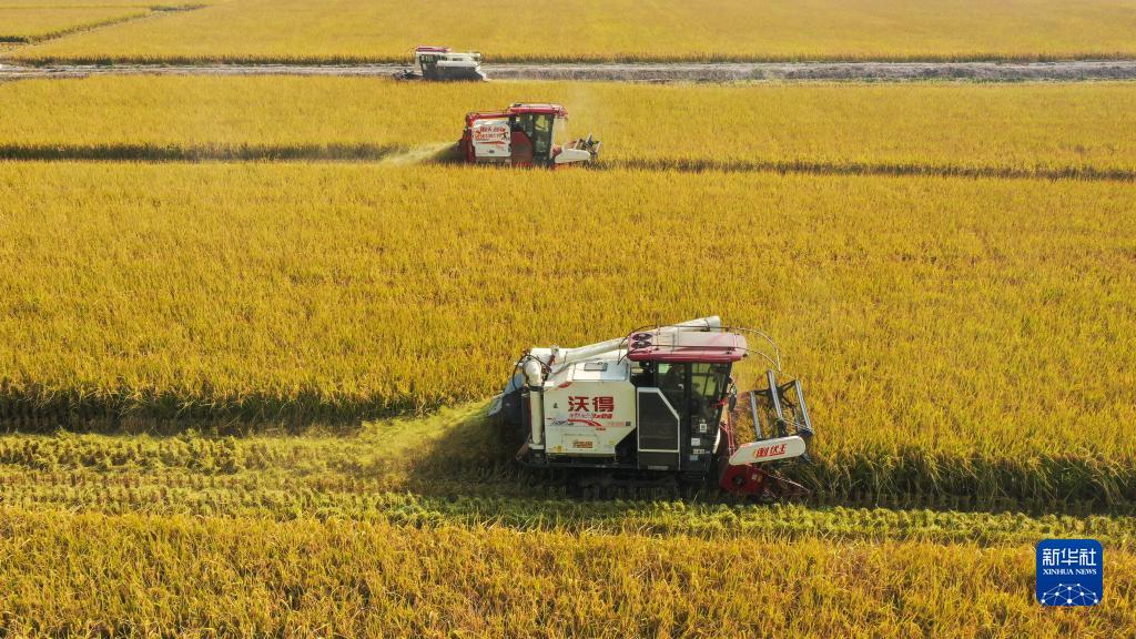 11月3日,江蘇省泗陽縣城廂街道卜湖家庭農場,種植戶搶抓晴好天氣收獲水稻(無人機照片)。