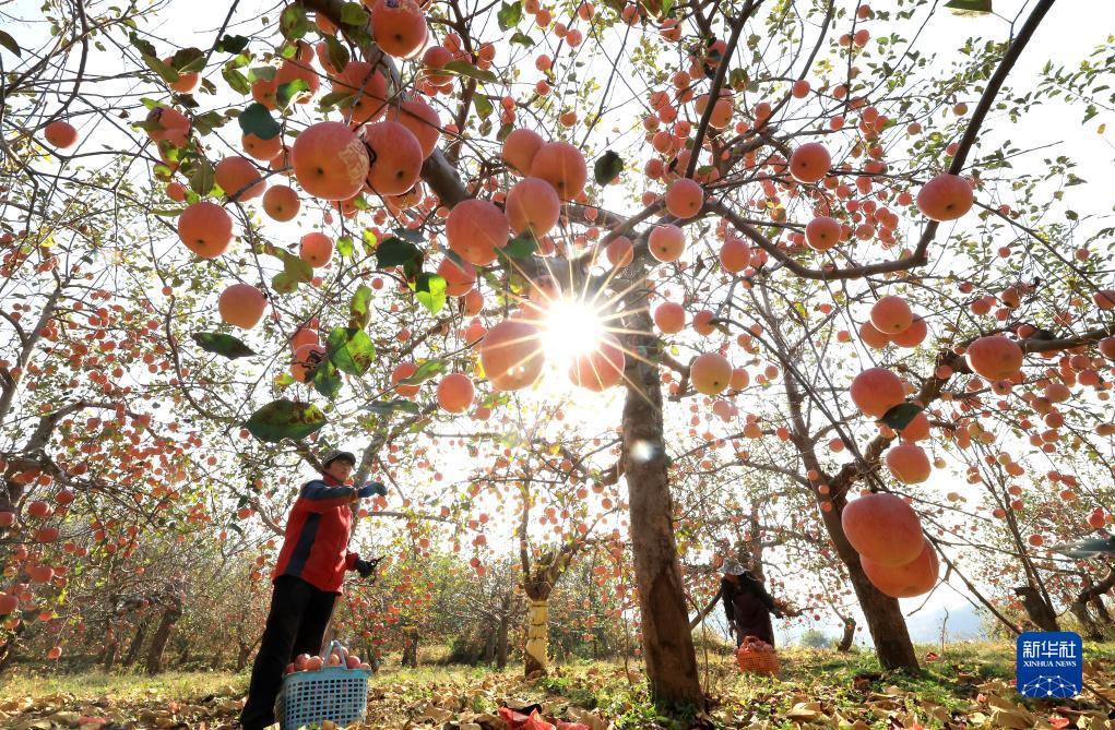 11月4日,河北省平山縣孟家莊鎮元坊村的農民在蘋果種植基地采收蘋果。