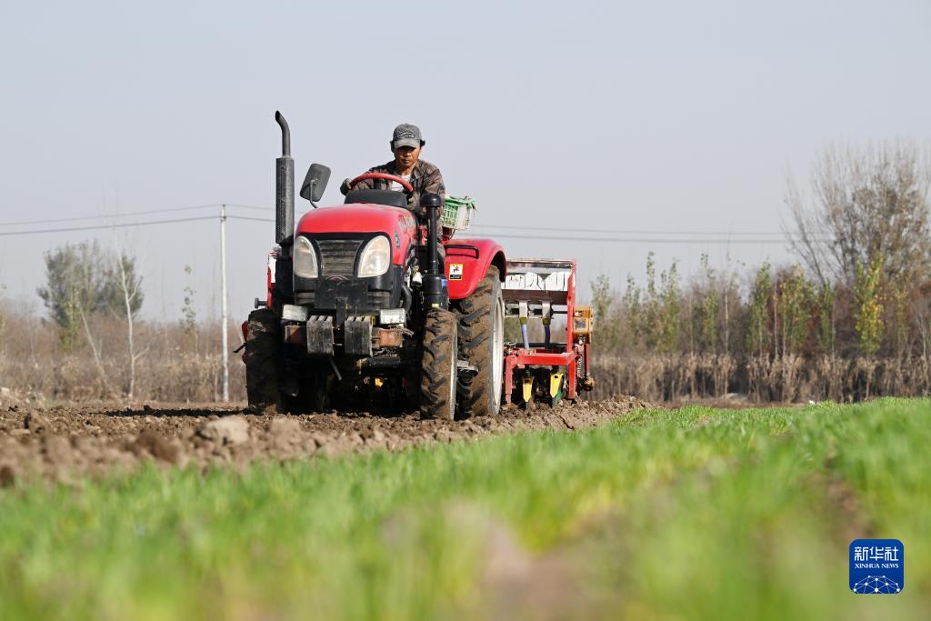 11月4日,天津市靜海區臺頭鎮農民操作農機播種小麥。
