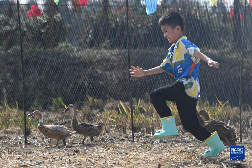 11月4日,小朋友在南潯區(qū)雙林鎮(zhèn)萬畝稻蝦綜合種養(yǎng)示范區(qū)的稻田游園會(huì)捉鴨子。