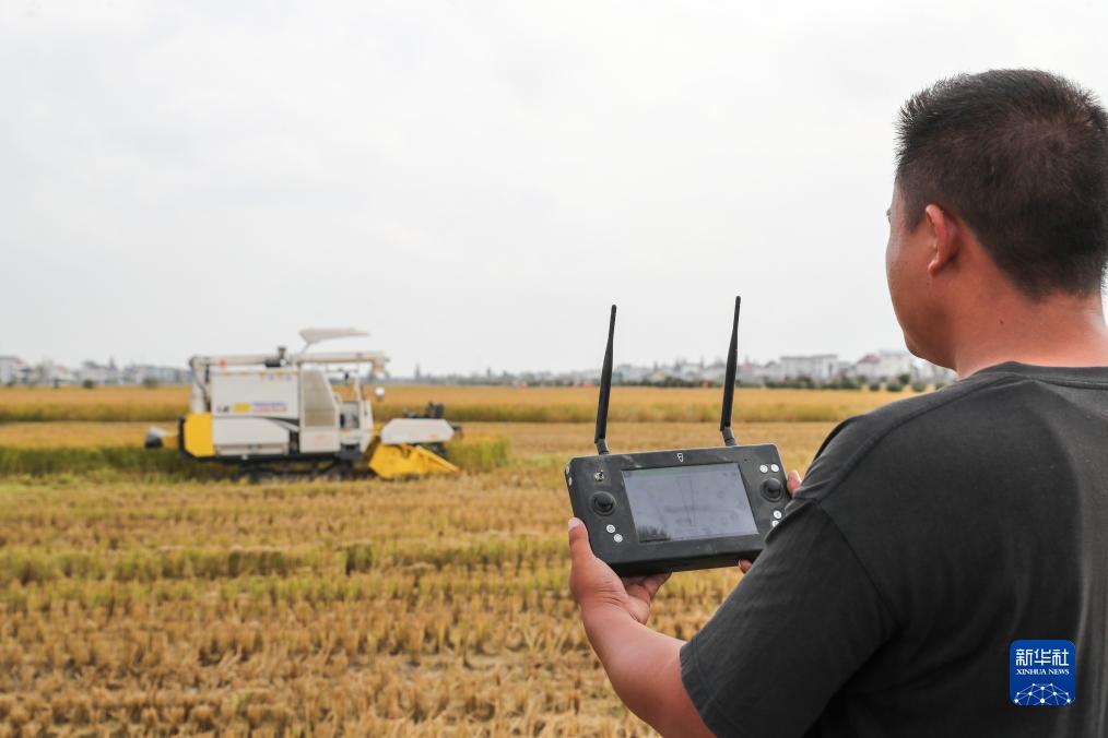 11月4日,在南通市通州區十總鎮育民村農場,技術員查看一臺設置好參數的無人收割機工作情況。