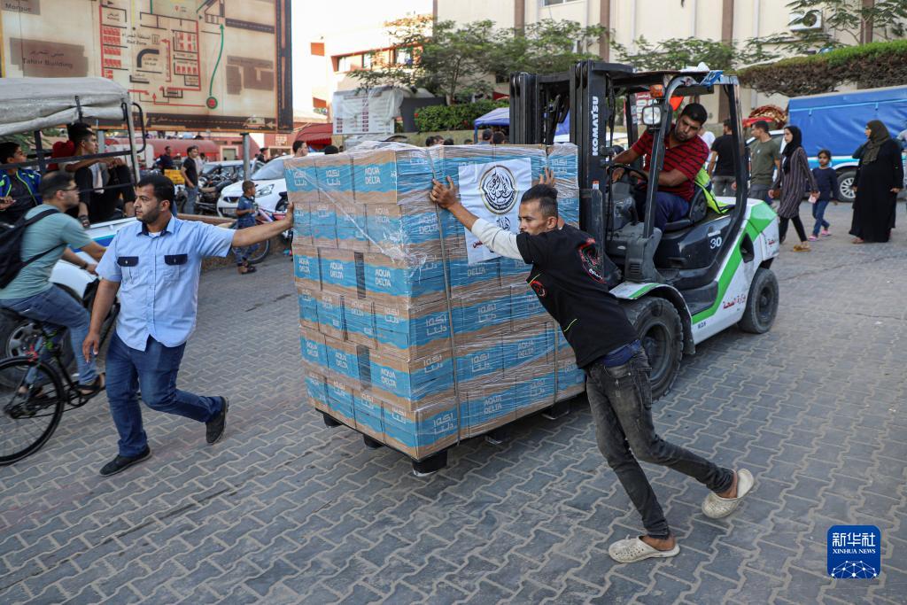 11月4日,在加沙南部城市汗尤尼斯,工人搬運(yùn)救援物資。