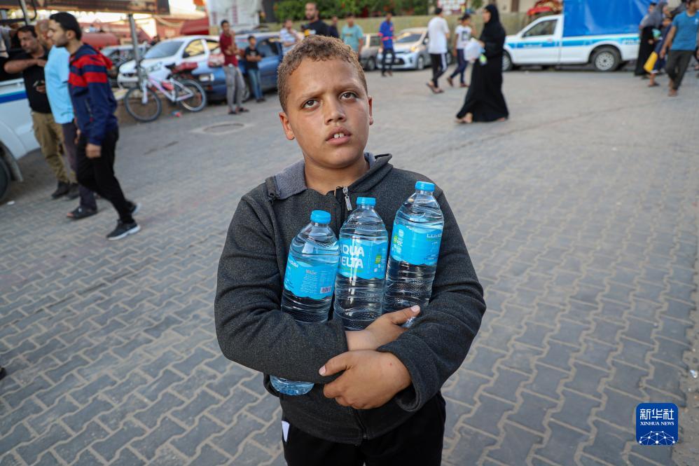11月4日,在加沙南部城市汗尤尼斯,一名兒童抱著自己分到的水。