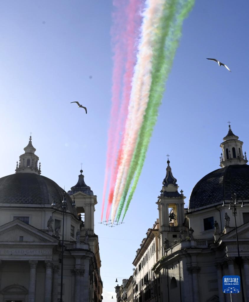 11月4日,意大利“三色箭”飛行表演隊(duì)噴出象征國旗三色的煙霧飛過羅馬上空,慶祝國家團(tuán)結(jié)日。