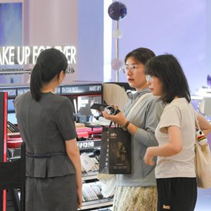 游客在中免集團(tuán)??谌赵聫V場免稅店選購免稅商品(4月30日攝)。