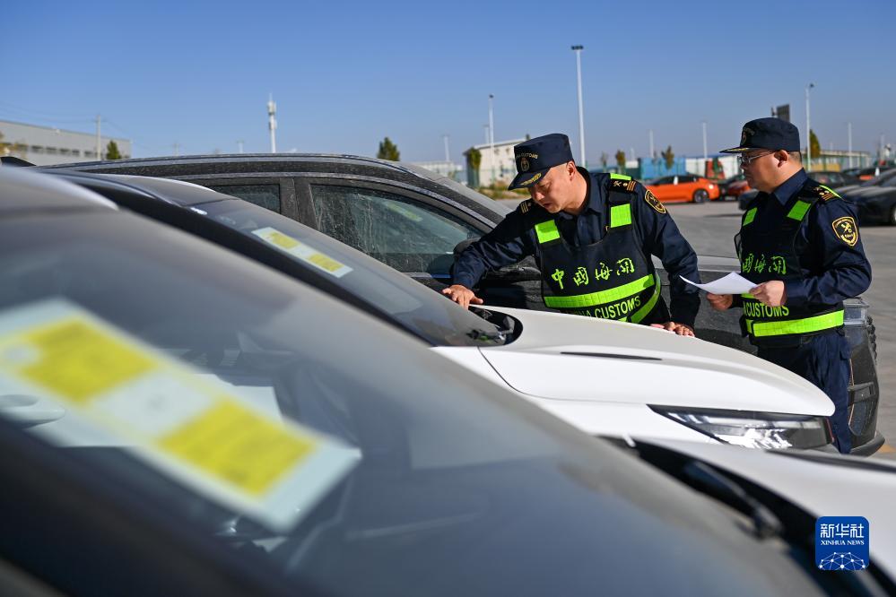 海關(guān)關(guān)員在新疆喀什綜合保稅區(qū)內(nèi)的海關(guān)施封集中查驗(yàn)作業(yè)區(qū)查驗(yàn)出口商品車(chē)(11月4日攝)。