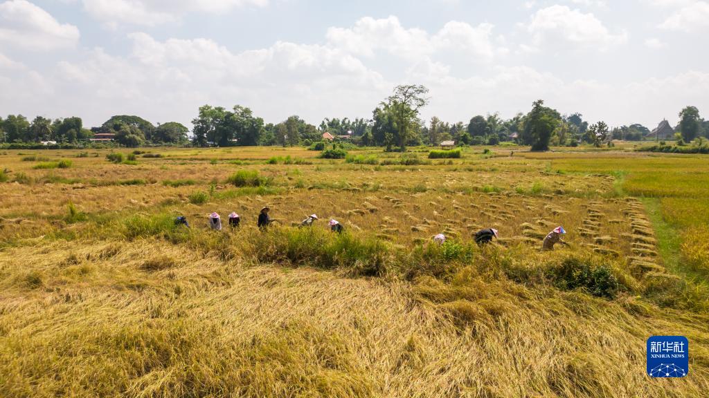 11月4日,農民在老撾首都萬象一處田地里勞作(無人機照片)。