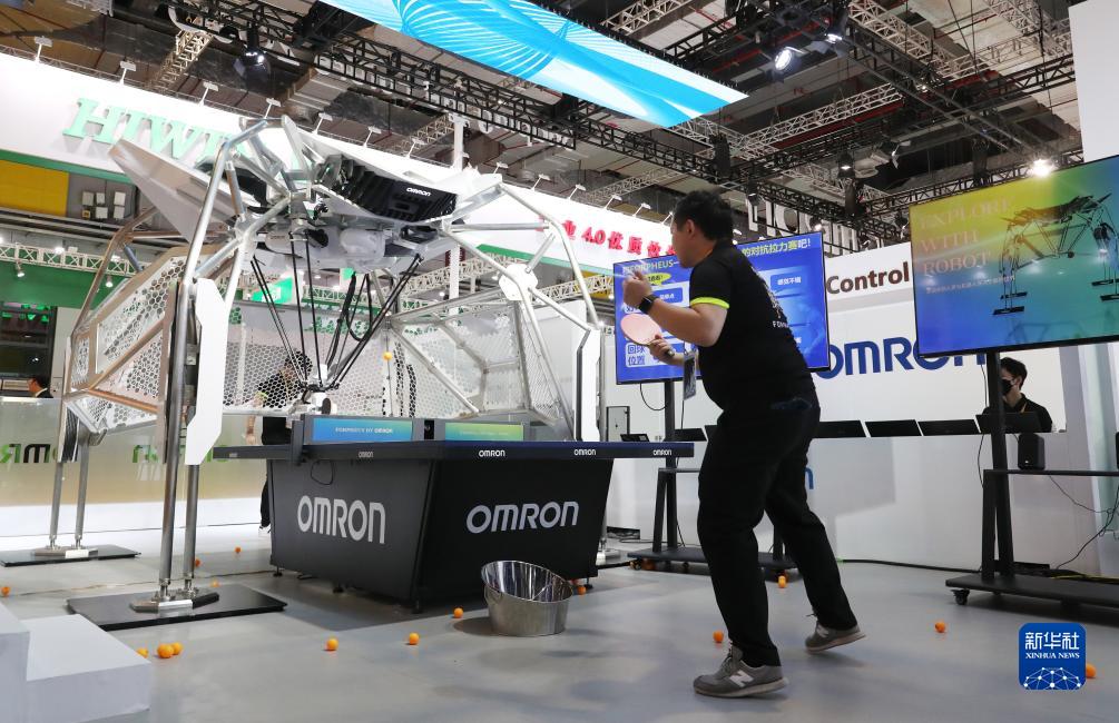 11月5日,工作人員(右)在第六屆進博會上展示歐姆龍公司展出的第八代FORPHEUS乒乓球教練機器人。