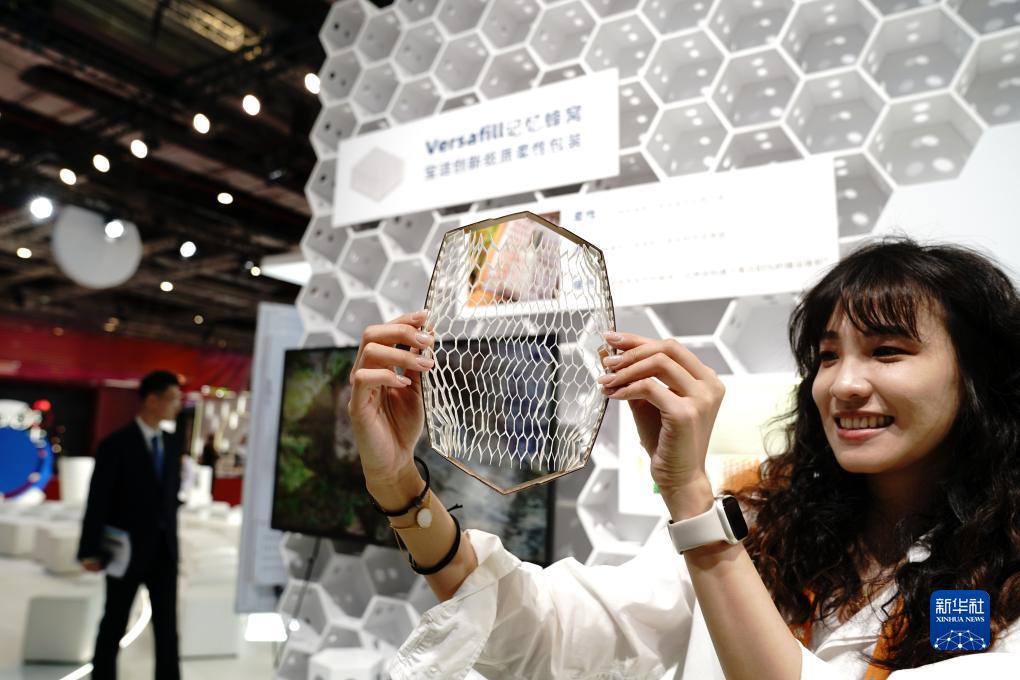 11月5日,在第六屆進博會消費品展區(qū)寶潔展臺,工作人員介紹全球首發(fā)的“記憶蜂窩”創(chuàng)新紙質(zhì)柔性包裝產(chǎn)品。