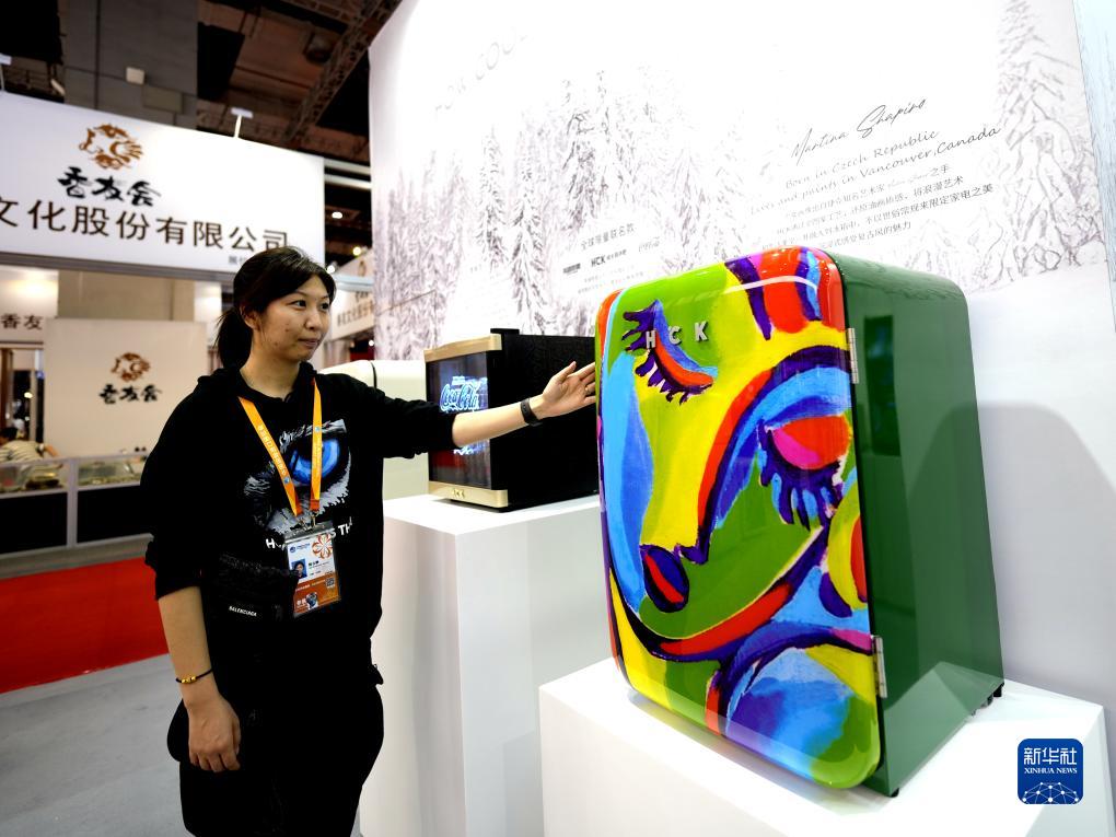 11月5日,在第六屆進(jìn)博會(huì)消費(fèi)品展區(qū)HCK哈士奇冰吧展臺(tái),工作人員介紹首次展示的一款復(fù)古冰箱。
