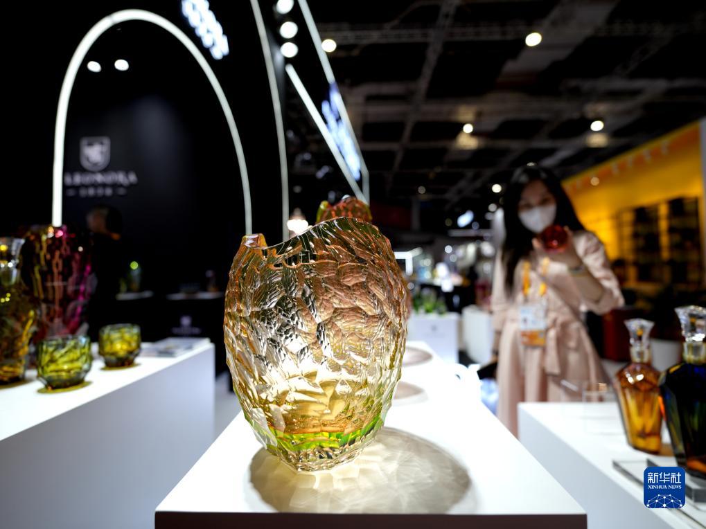 11月5日,觀眾在第六屆進博會消費品展區捷克歐若拉水晶展臺參觀首次展出的水晶新品。