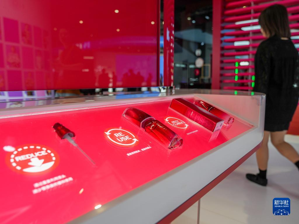 11月5日在第六屆進博會消費品展區資生堂展臺拍攝的紅腰子空瓶。資生堂在進博會上首發首秀的“紅腰子空瓶再續計劃”,可讓化妝品空瓶實現100%循環使用。