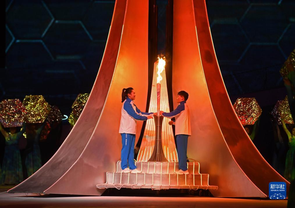 11月5日,火炬手黃雅晴(左)、蘭星宇點燃主火炬。