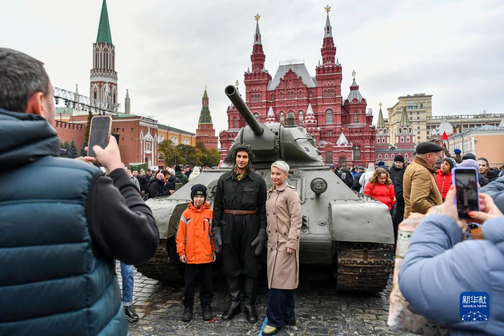 11月5日,在俄羅斯首都莫斯科,人們在以紀念1941年蘇聯紅場閱兵式為主題的露天展覽上拍照。