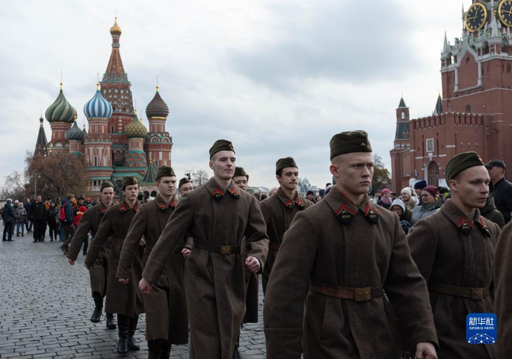 11月5日,在俄羅斯首都莫斯科,參加紀念活動的演員走過紅場。
