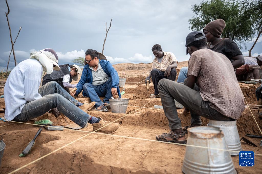 11月3日,中肯聯合考古隊隊員顧雪軍(左三)在位于肯尼亞巴林戈郡馬里加特鎮的考古現場進行發掘工作。