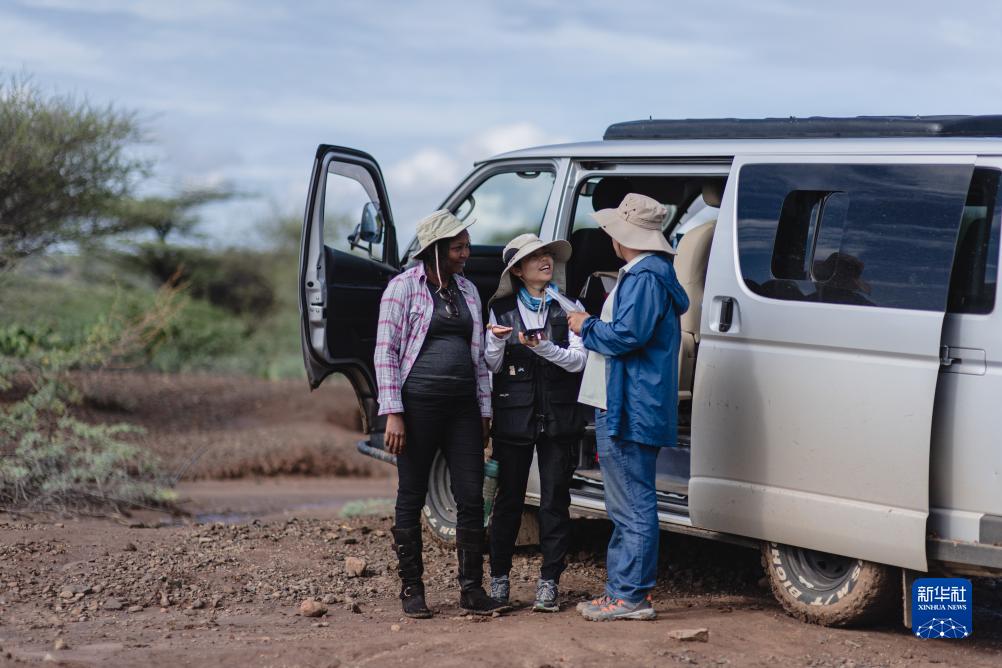 11月4日,中肯聯合考古隊隊員彭勝藍(中)和顧雪軍(右)在位于肯尼亞巴林戈郡馬里加特鎮的考古現場與肯方隊員交流發掘出的石器。