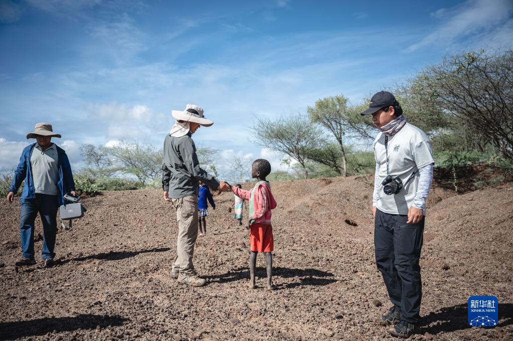 11月4日,中肯聯合考古隊中方現場負責人趙清坡(左二)在位于肯尼亞巴林戈郡馬里加特鎮的考古現場周邊區域進行野外調查時與當地兒童交流。