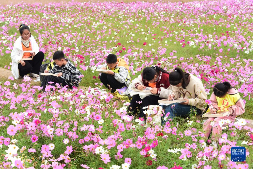 11月4日,在湖南省常德市澧縣城頭山國家考古遺址公園,學生在花海里寫生。