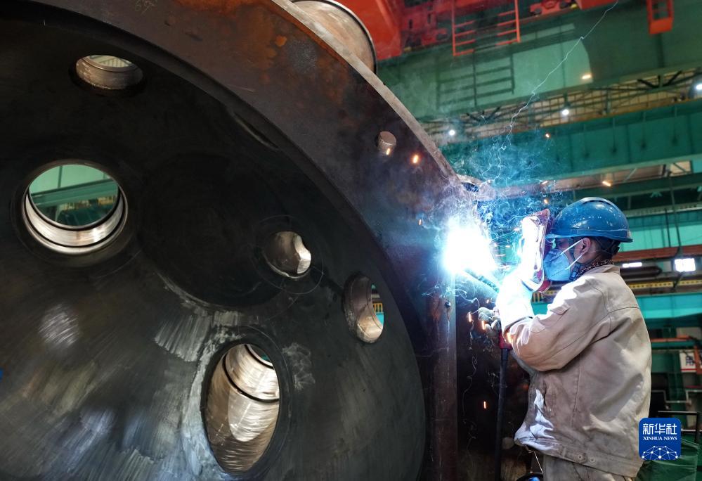 11月5日,工人在秦皇島經濟技術開發區哈電集團(秦皇島)重型裝備有限公司的生產車間工作。