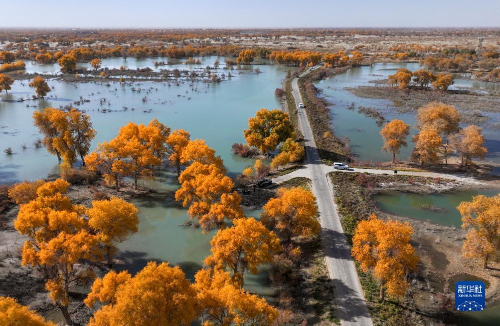 游客在新疆尉犁縣羅布淖爾國家濕地公園自駕觀光(11月4日攝,無人機照片)。
