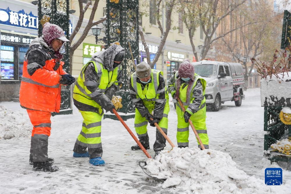 11月6日,工人在哈爾濱中央大街上鏟除積雪。