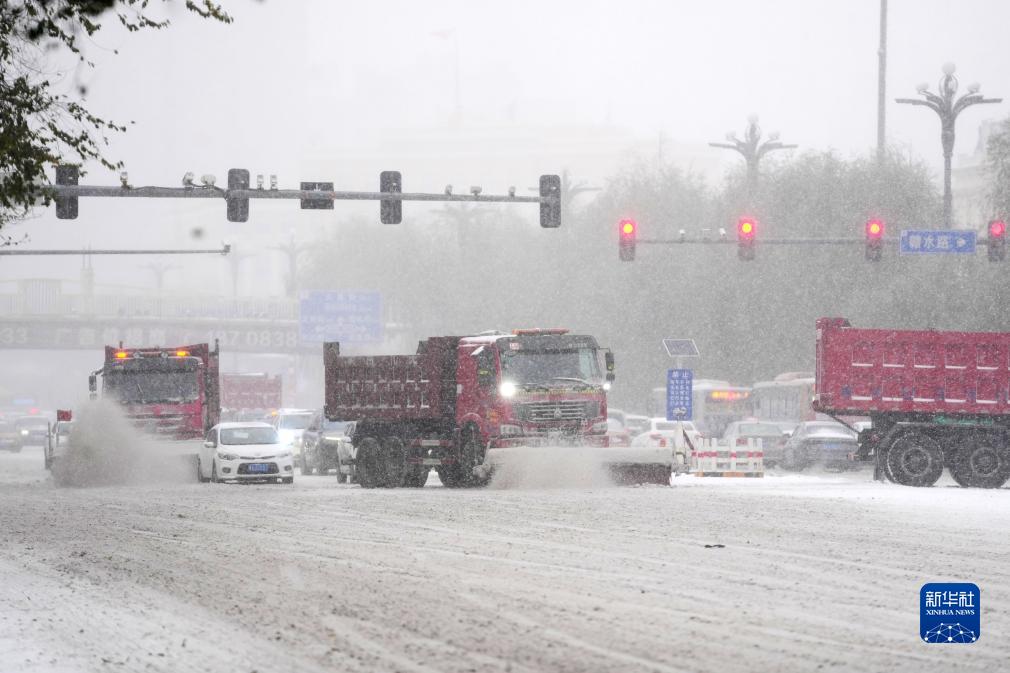 11月6日,在哈爾濱市主干道中山路上,清雪車輛在作業。