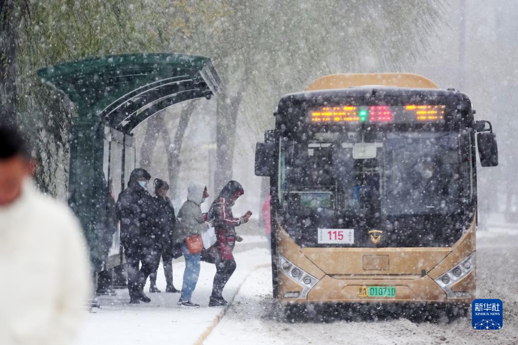 11月6日,哈爾濱市民在風雪中乘坐公交車出行。