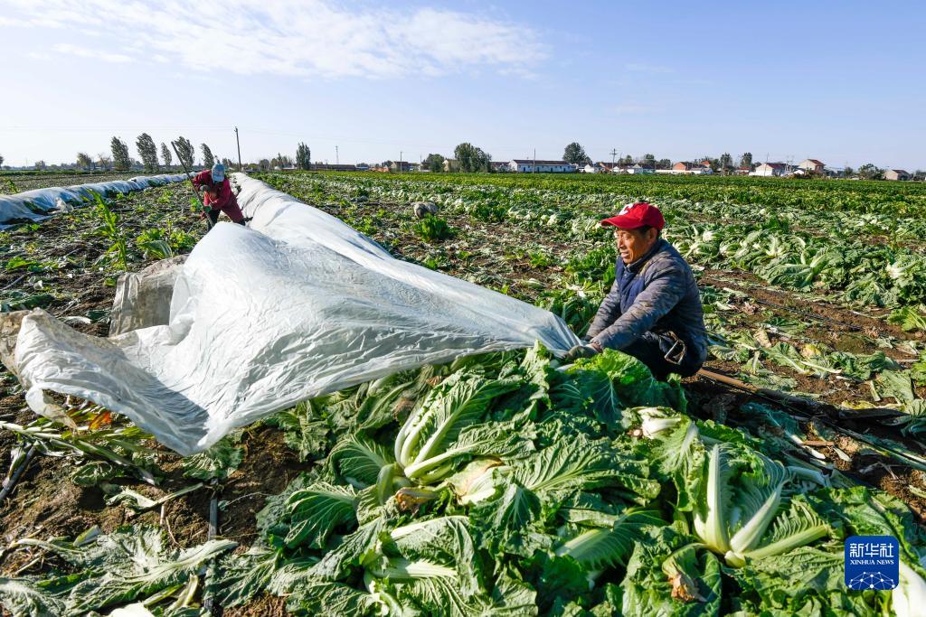 11月6日,河北省玉田縣虹橋鎮(zhèn)農(nóng)民在苫蓋收獲的白菜。