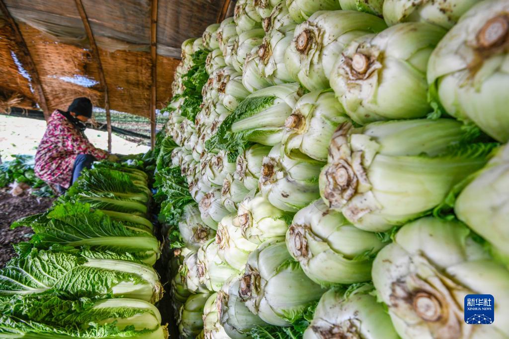 11月6日,河北省玉田縣虹橋鎮農民在暖棚儲存白菜。
