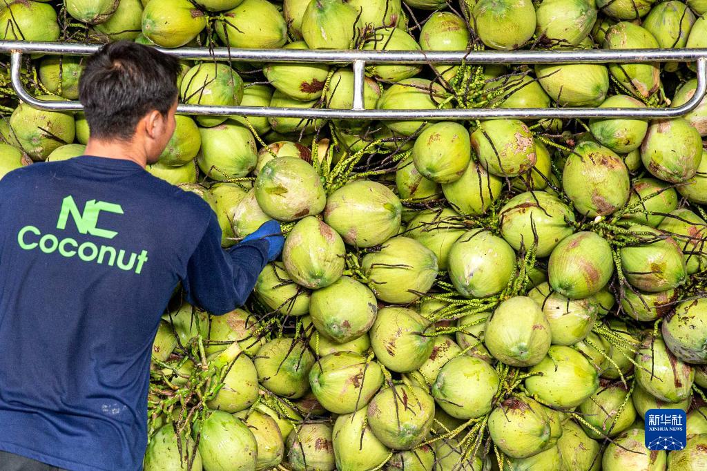 11月3日,工人在泰國(guó)叻武里府丹嫩沙多的椰子工廠卸貨。