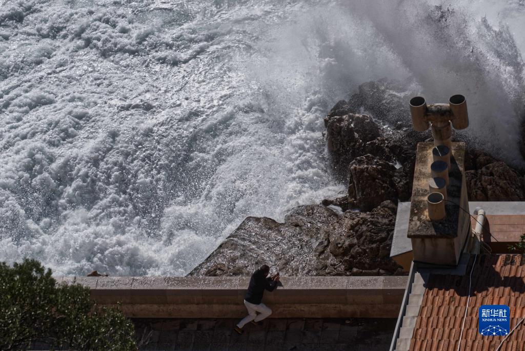 近日,受風暴天氣影響,法國尼斯海岸巨浪拍岸,吸引人們駐足觀看。
