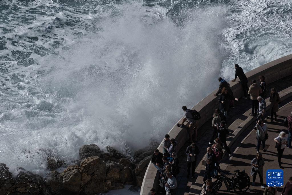 近日,受風暴天氣影響,法國尼斯海岸巨浪拍岸,吸引人們駐足觀看。
