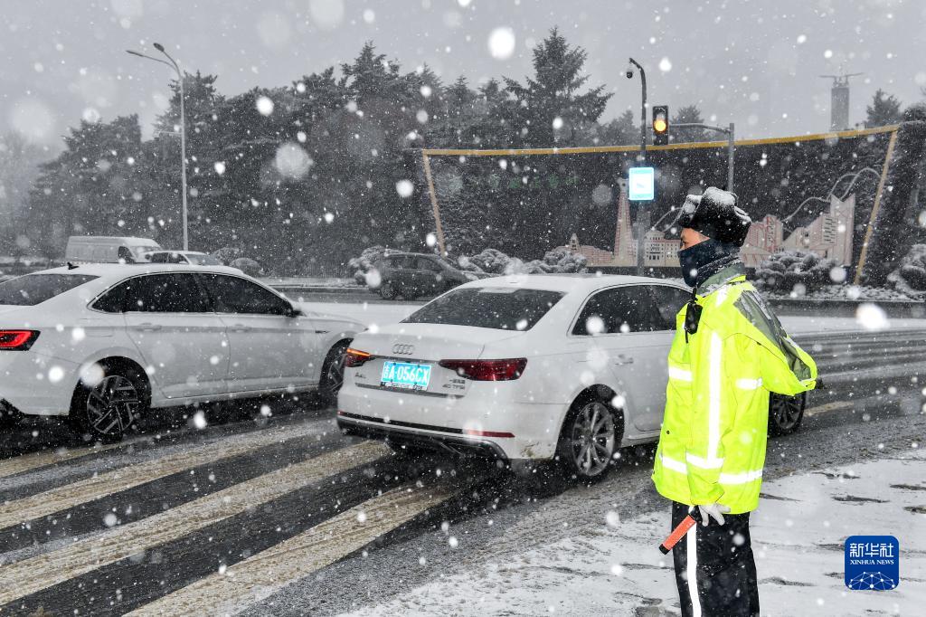 11月6日,在長春市街頭,一名執勤交警在雪中指揮交通。