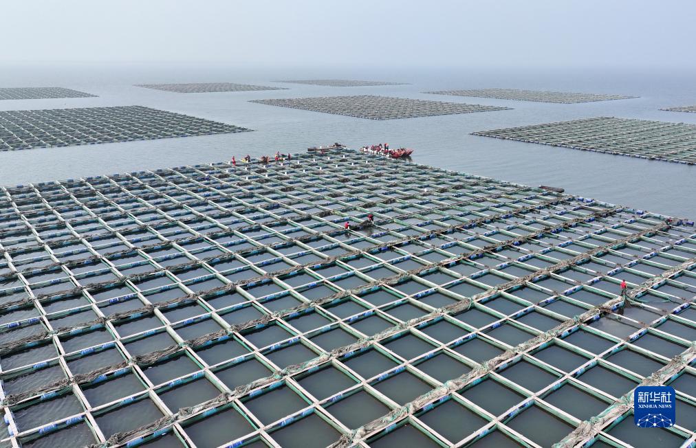 11月6日,河北省唐山市曹妃甸區(qū)一家深海網(wǎng)箱海參養(yǎng)殖合作社的社員在捕撈海參(無人機(jī)照片)。