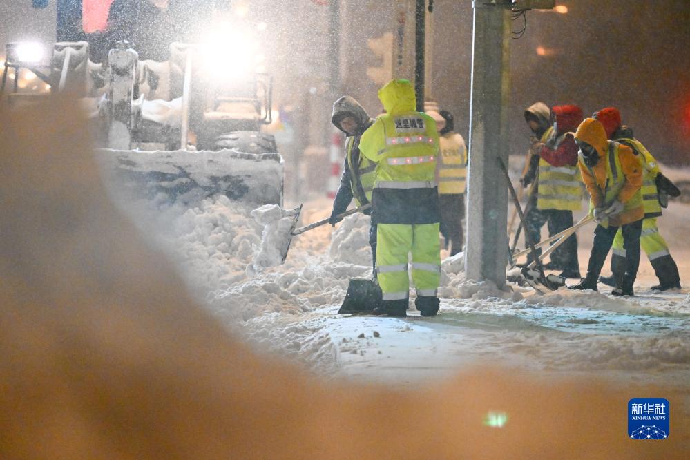 11月6日,工人在哈爾濱友誼西路上鏟除積雪。