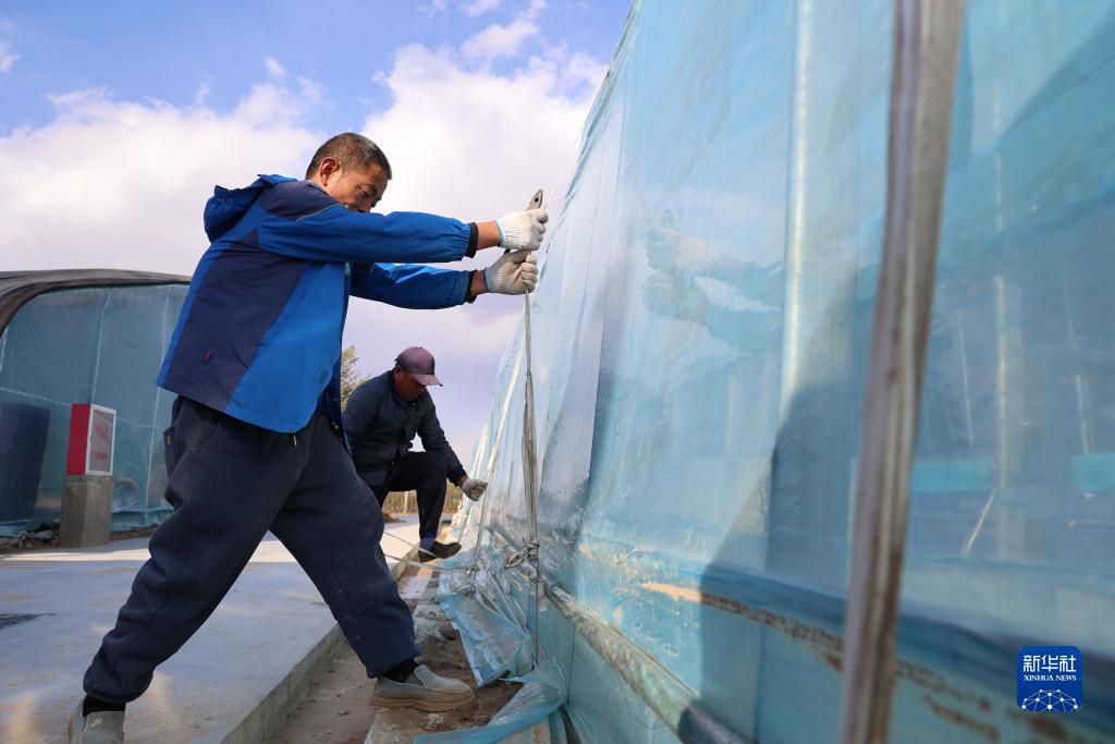 11月6日,山東省濱州市濱城區楊柳雪鎮農民在加固蔬菜大棚。