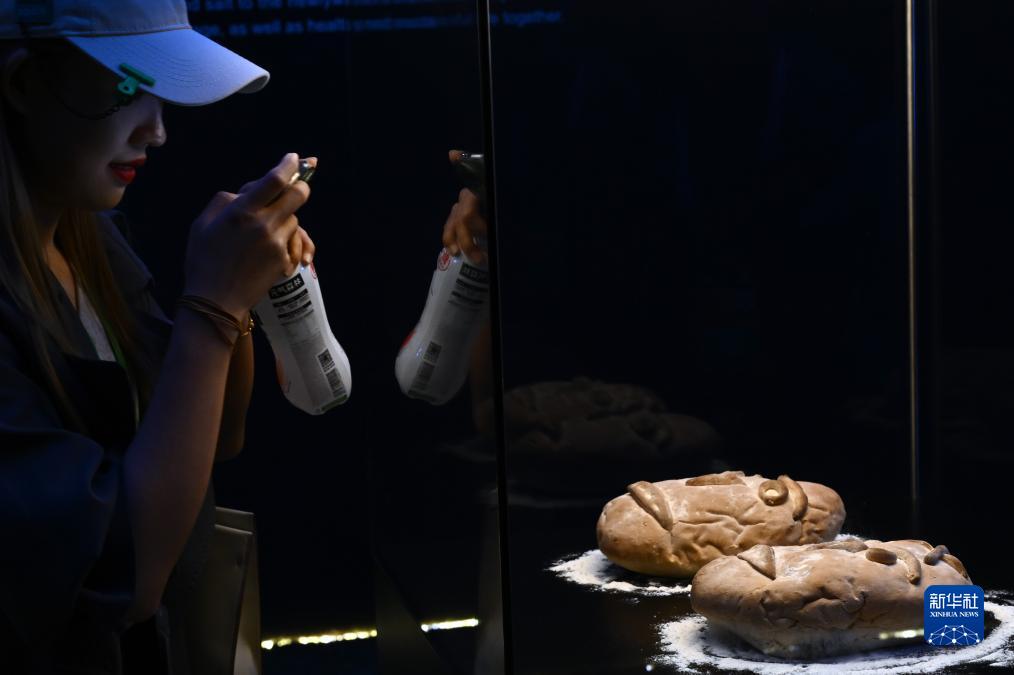 11月6日,參觀者在第六屆進(jìn)博會國家展塞爾維亞展臺欣賞展出的塞爾維亞面包。