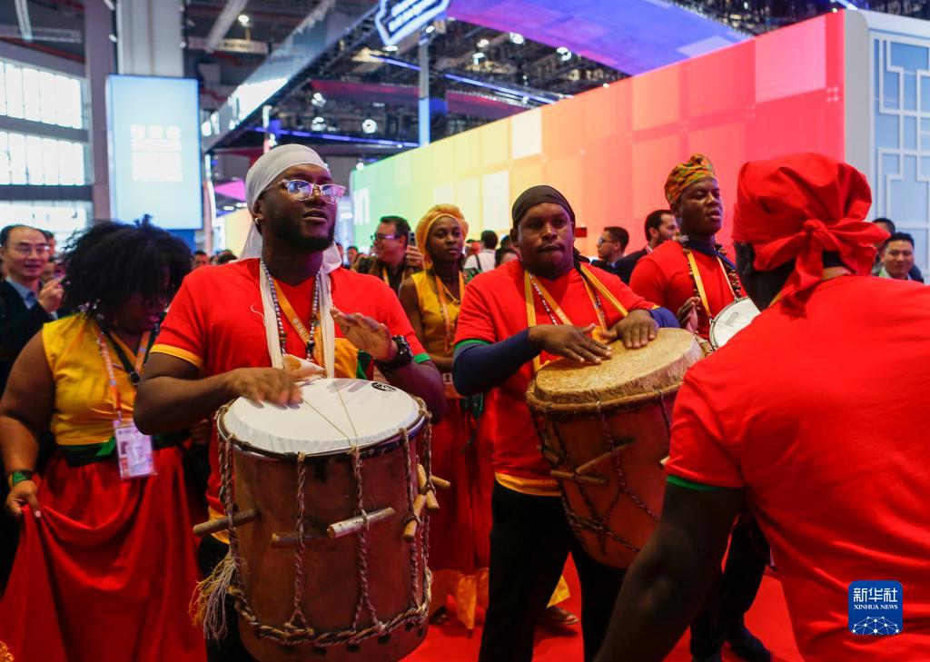 11月6日,來自第六屆進博會國家展洪都拉斯展臺的演職人員在現場進行文藝表演。