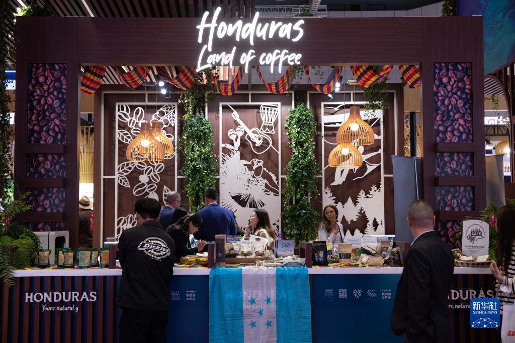 11月6日,參觀者在第六屆進博會國家展洪都拉斯展臺咨詢咖啡豆等展品信息。